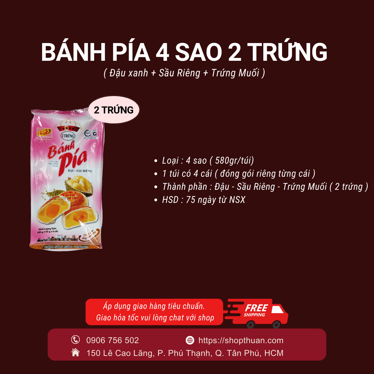 Bánh pía 4 sao 2 trứng đậu sầu riêng 580g ( 4 cái ) – Tân Huê Viên